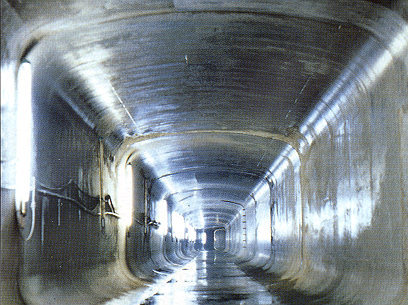 Innenansicht eines mit der DPLEX-Schildvortriebsmethode mit Tübbingausbau aufgefahrenen und mit einer Ortbetoninnenschale ausgekleideten Abwasserkanals mit rechteckförmigem Querschnitt (H/B = 3,98 m/4,38 m) (Image) [FI-DAIHO]