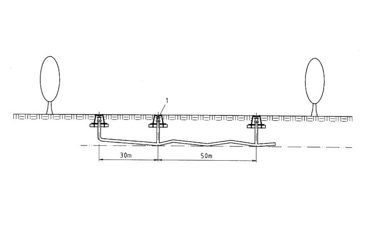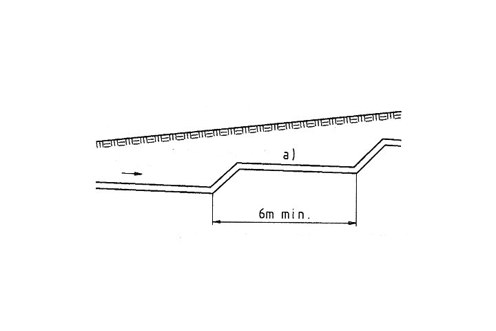 In flachem oder ansteigendem Gelände wird das Mindestgefälle der Unterdruckkanäle durch künstliche Anstiege (Höhendifferenz der Rohrsohlen) realisiert (Bild 6.2.2.5.4-7). Die Höhe der einzelnen Anstiege sollte so gering wie möglich gehalten werden und 1,5 m nicht überschreiten, so dass sich der Unterdruck verlustarm ausbreiten kann. Mehrere kleine Anstiege sind einem großen vorzuziehen. Der Abstand zwischen diesen Anstiegen bzw. Tiefpunkten sollte mindestens 6 m (Bild 6.2.2.5.4-8) und maximal 30 m, bei Hausanschlussleitungen 1,5 m betragen [DINEN1091].