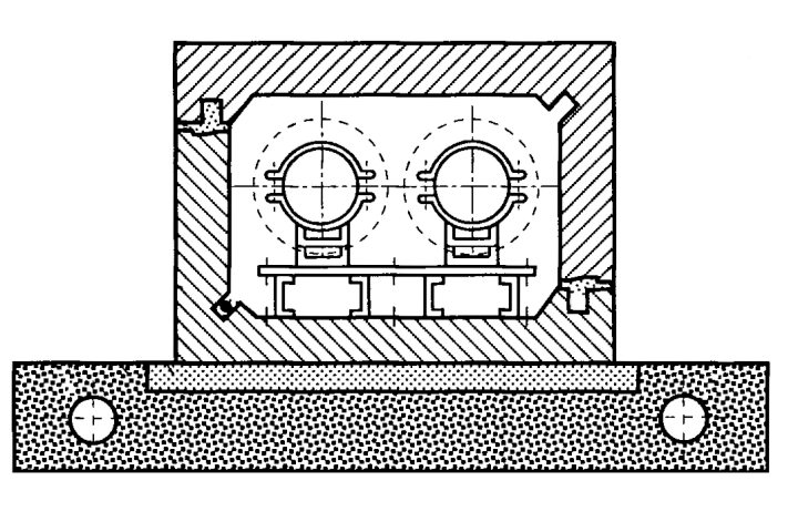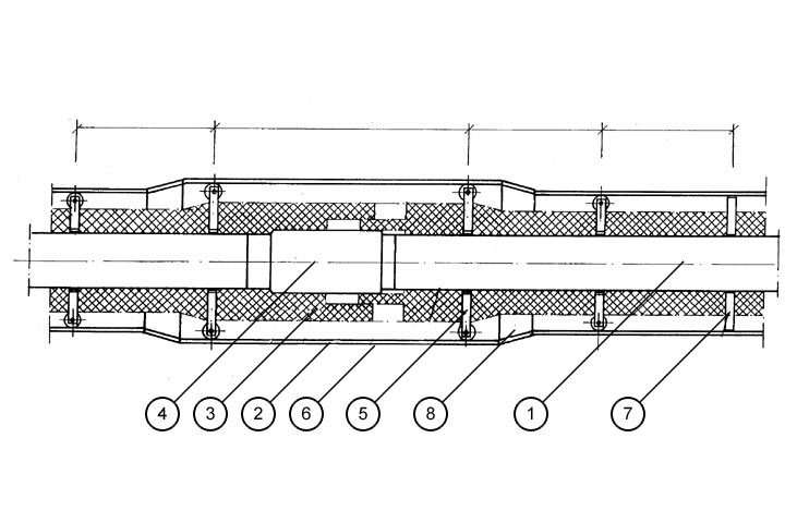 Sofern für diese kein ausreichender Platz zur Verfügung steht, können zur Dehnungsaufnahme bei SMR auch Axialkompensatoren eingesetzt werden (Bild 6.2.2.4-22). In diesem Fall werden die Dehnbewegungen des Stahlmediumrohres innerhalb des Mantelrohres aufgenommen, wobei das Mediumrohr in der Regel auf Axialrollen- oder -gleitlagern montiert ist, die eine Wärmedämmung zum Mediumrohr erhalten (Bild 6.2.2.4-23) (Bild 6.2.2.4-24).