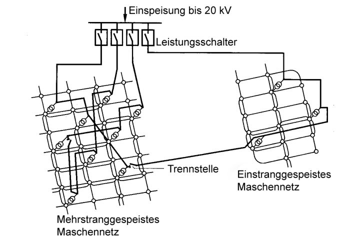 Die Einspeisung der vernaschten Niederspannungsnetze kann über einen (einstranggespeistes Maschennetz) oder über mehrere Mittelspannungsstränge (mehrstranggespeistes Maschennetz) erfolgen (Bild 6.2.2.6.3-2).