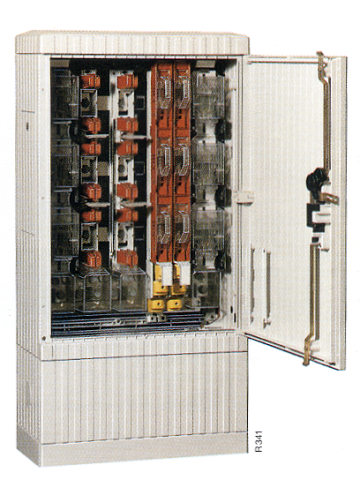 Kabelverzweigerschränke (KVz) - Blick in einen KVz mit Sicherungs- und Schaltleisten [FI-Geyer] |