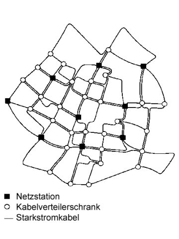 Beim konventionellen Niederspannungsnetz der öffentlichen Versorgung folgen die Trassen der Kabel (Hauptkabel) den Straßenzügen (Bild 6.2.2.6.3-1).