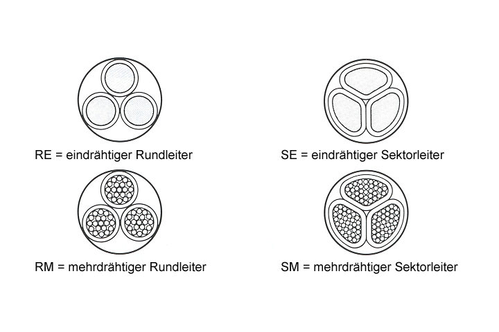 - Mehradrige Kabel: Kabel mit zwei bis fünf Adern einschließlich der als Neutralleiter oder Schutzleiter zu verwendenden Adern.