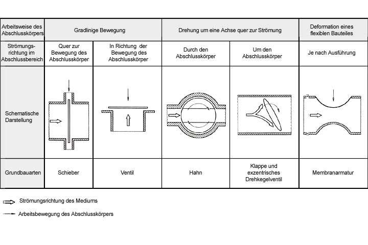 Im (Image 6.2.2.2-5) sind die Grundbauarten von Armaturen nach DIN EN 736-1 [DINEN736-1], eingeteilt nach ihren Konstruktionsmerkmalen dargestellt.