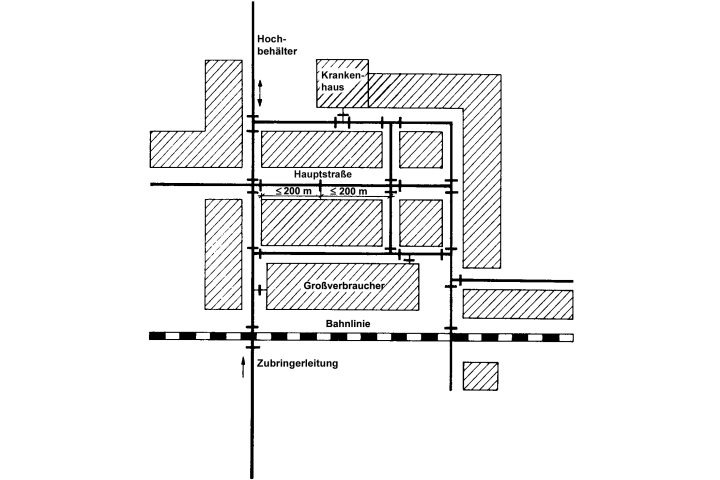 Mit Hilfe von Armaturen werden Versorgungsnetze so in Teilstrecken gegliedert, dass bei Rohrreinigung, Rohrbruch, Reparatur oder Erneuerung bzw. Erweiterung möglichst wenige Anlieger von der Rohrabsperrung betroffen sind (Image 6.2.2.2-6) [DVGWAW332]. Dies bedingt an Abzweigen zwei, an Kreuzungen drei Absperrarmaturen.