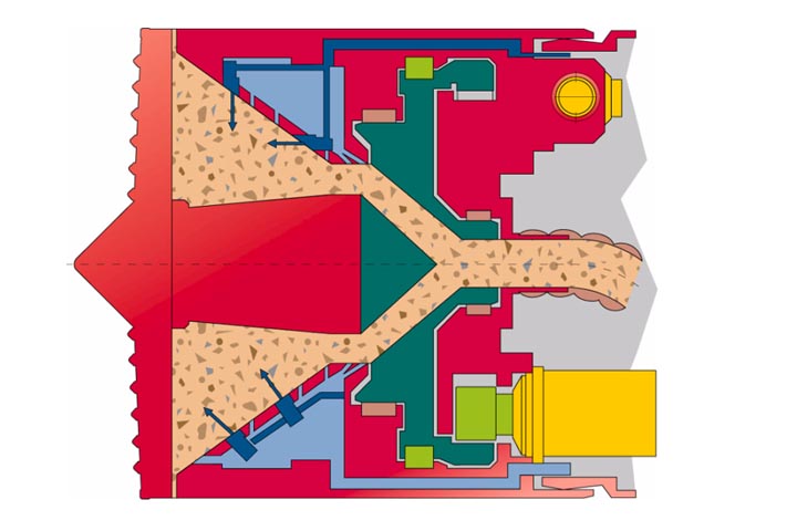 Um die Einsatzgrenzen auch auf Lockergesteine der Zusatzklassen S nach DIN 18319 [DIN18319] und auf Fels mit hohem Trennflächenanteil auszudehnen, werden die meisten Vortriebsmaschinen mit einem Steinbrecher z.B. in Form eines Kreisel- oder Konusbrechers ausgestattet (Bild 7.4.3.3-2) (Bild 7.4.3.3-3) (Bild 7.4.3.3-4) (Bild 7.4.3.3-5) (Bild 7.4.3.3-8). Diese nach dem Kaffeemühlenprinzip arbeitenden Brecher sind so ausgelegt, dass Steine, Blöcke und Felsbrocken bis zu einer maximalen Größe von etwa dmax = 1/3 des Bohrkopfaußendurchmessers auf die jeweils noch förderbare Korngröße gebrochen werden können.