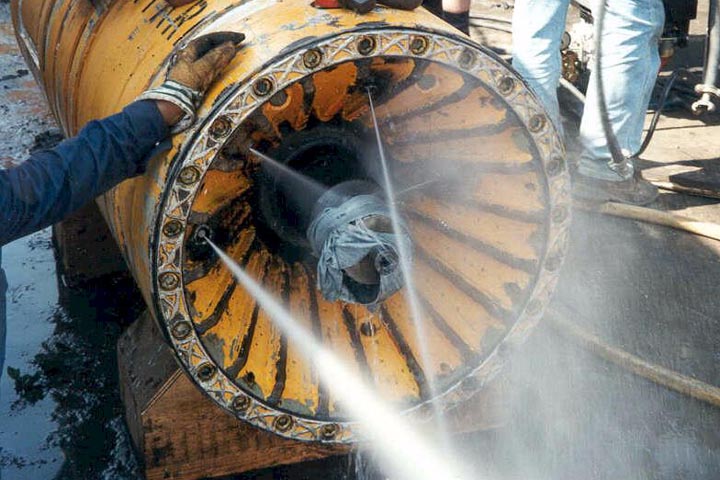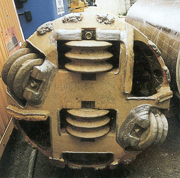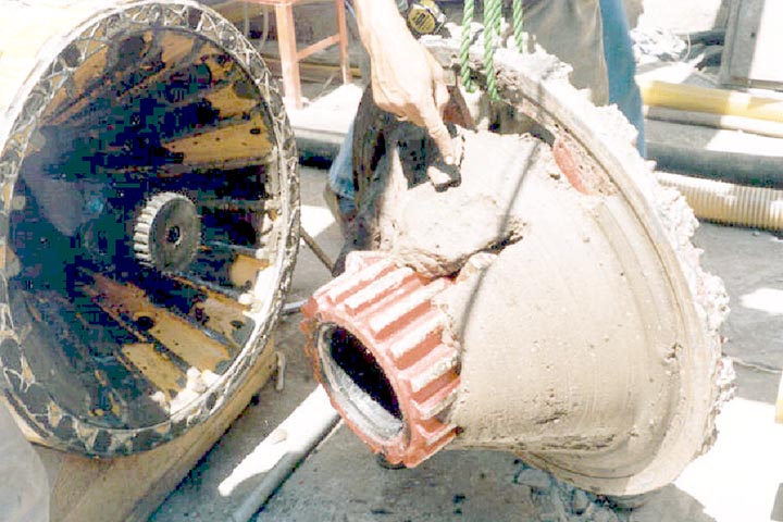 Ebenso wie die Bohrwerkzeuge können auch die Brechereinrichtungen in Abhängigkeit der Lockergesteinsarten durch Zusammenballung und hohe Verdichtung des Bohrkleins, aber auch durch Bildung rotierender "Tonmänner" in ihrer Leistungsfähigkeit stark beeinträchtigt werden (Bild 7.4.3.3-8). Diese Zusammenballungen können durch das normale Niederdrucksystem des Spülkreislaufs in der Regel nur ungenügend oder gar nicht gelöst werden [Pheli98] [Godin96] [Rapha93]. Hier bietet sich die Installation eines Hochdruckspülsystems an, bei dem über im Brecherraum oder im Bohrkopf angeordnete Düsen Hochdruckwasserstrahlen mit 300 bar bis 400 bar und einem Volumenstrom von 40 l/min bis zu 50 l/min auf die Bohrwerkzeuge bzw. die Rotorwelle des Brechers einwirken (Bild 7.4.3.3-9) (Bild 7.4.3.3-10) .