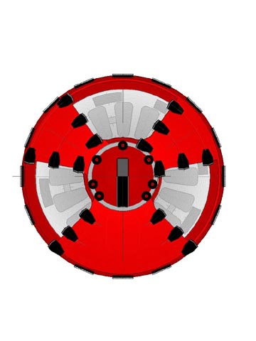 Mikrotunnelbaumaschine mit pneumatischer Förderung (Verfahren AVP [FI-Herreb]) - Ansicht des Standardbohrkopfes (Schürfscheibe) mit Blick auf die Zellenradschleuse hinter der Abbaukammer |