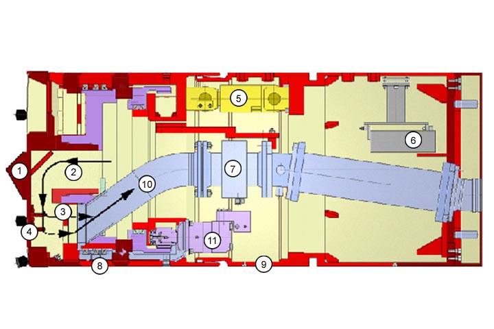 Mikrotunnelbauverfahren mit pneumatischer Förderung auf Basis einer Sauganlage sind charakterisiert durch den Vortrieb von Rohren bei gleichzeitigem vollflächigen Abbau der mechanisch- und erddruckgestützten Ortsbrust durch einen Bohrkopf und kontinuierlicher Abförderung des Bohrkleins mit Hilfe von Luft als Spülmittel aus der durch eine Zellenradschleuse begrenzten Abbaukammer im Bohr- und Steuerkopf nach über Tage (Bild 7.4.3.4-3) (Bild 7.4.3.4-2) (Bild 7.4.3.4-4). Dort wird es in einem Vorabscheider vom Luftstrom separiert. Die Antriebsaggregate für den Bohrkopf sowie für die Steuerzylinder sind unmittelbar in der Vortriebsmaschine angeordnet.