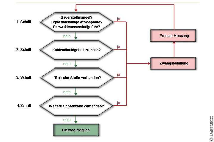 "Vor Beginn der Arbeiten muß vom Aufsichtführenden festgestellt werden, ob Gefahren durch Stoffe an den zu betretenden Arbeitsstellen vorhanden sind. Gegebenenfalls sind Maßnahmen gegen Gefahren zu treffen, die während der Arbeiten auftreten können. Messungen sind dabei von einer gesicherten Position aus vorzunehmen.