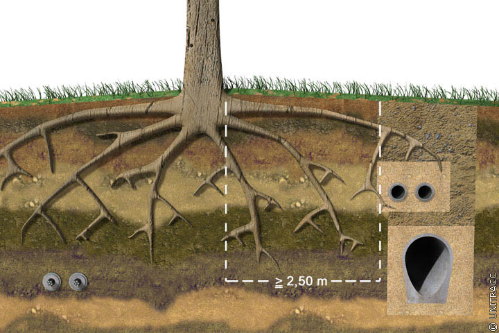 Bereits im Planungsstadium sind wurzelschützende Maßnahmen wie Durchbohrungen, Durchpressungen oder der Bau von Wurzelvorhängen in Abstimmung mit den Grünflächenämtern zu prüfen.