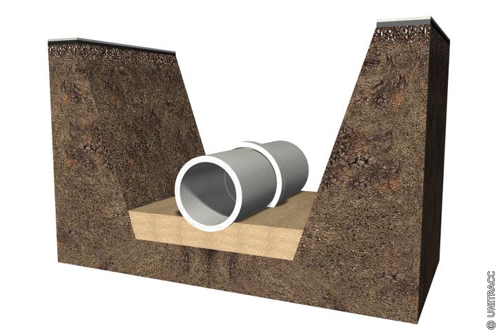 Durch den Grabenaushub ergeben sich unterschiedliche Baugrundzonen und zwar der anstehende ungestörte Baugrund (anstehender Boden nach DIN EN 1610 [DINEN1610:1997] ) sowie der gestörte Baugrund im Bereich des Grabenquerschnittes bzw. in der Dammschüttung. Die Abmessungen des gestörten Baugrundbereiches werden durch die Grabentiefe und -breite bestimmt. Die Gesamtgrabenbreite setzt sich dabei aus der Mindestgrabenbreite zuzüglich der Dicke des Verbaus zusammen, die beispielsweise beim senkrechten Normverbau mit Tafelprofilen und waagerechten Gurtungen 0,4 m betragen kann. Im Querschnitt selbst unterscheidet man zwischen der Leitungszone und der Hauptverfüllung.