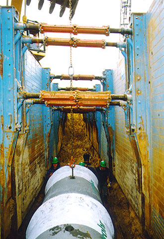 Bis vor wenigen Jahren wurden die Kanäle in der Bundesrepublik Deutschland fast ausschließlich in der offenen Bauweise, d.h. durch Ausheben eines Grabens, Verlegen der Leitung im Schutze einer Böschung oder eines Verbaues und anschließendes Verfüllen des Grabens, hergestellt (Grabenleitung) (Bild 1.6.1-1) .