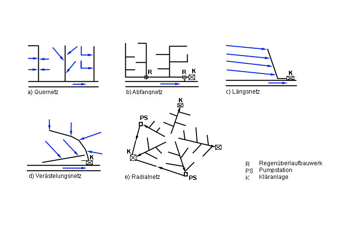Verlaufen die Sammler (z.B. Nebensammler, Hauptsammler) der einzelnen Teilgebiete vorwiegend senkrecht zu den Höhenlinien bzw. zum Vorfluter, so spricht man von einem Quernetz (Bild 1.2-2) . Muß das Abwasser vor Einleitung in den Vorfluter gereinigt werden, so sind die Sammler des Quernetzes vor Mündungen im Vorfluter abzufangen (Abfangnetz) (Bild 1.2-2) . Beim Längsnetz verlaufen die einzelnen Sammler unter sich und zum Vorfluter bzw. in Höhenlinien nahezu parallel (Bild 1.2-2) . Im Gegensatz dazu gibt es im Verästelungsnetz keine vorherrschende Sammelrichtung mehr (Bild 1.2-2) . Werden die Sammler der Teilgebiete strahlenförmig nach außen geführt, so spricht man vom Radialnetz (Bild 1.2-2) [Busch65] .