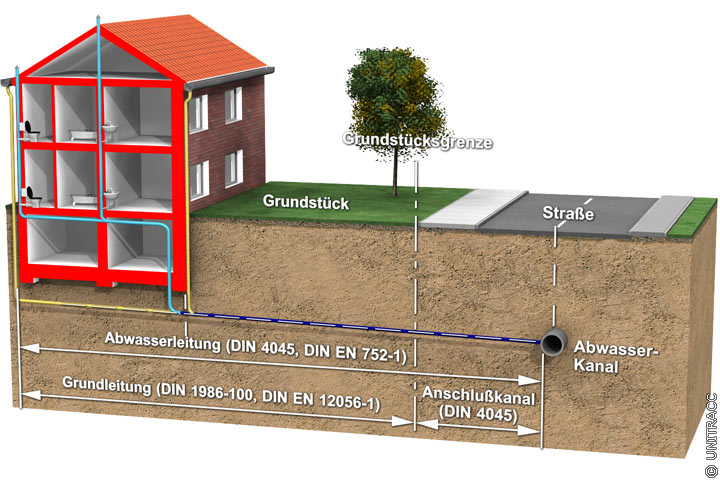 Die Rohrleitung der Grundstücksentwässerung bezeichnet man als Abwasserleitung nach DIN 4045 [DIN4045:1985] : Leitung zwischen Entwässerungsgegenständen und der Grundstücksgrenze bzw. der letzten Reinigungsöffnung (z.B. Übergabeschacht) auf einem Grundstück.