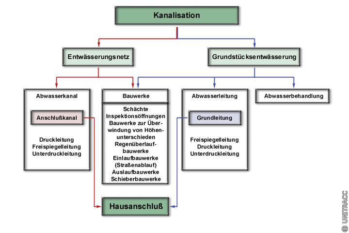 Kanalisation nach DIN 4045 [DIN4045:1985] : Anlage zur Sammlung und Ableitung von Abwasser. Sie besteht aus dem Entwässerungsnetz (Kanalnetz) und der Grundstücksentwässerung.