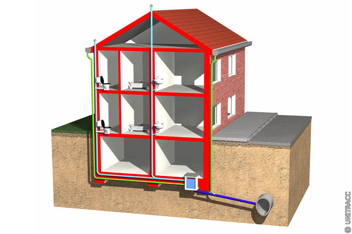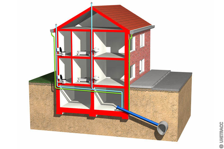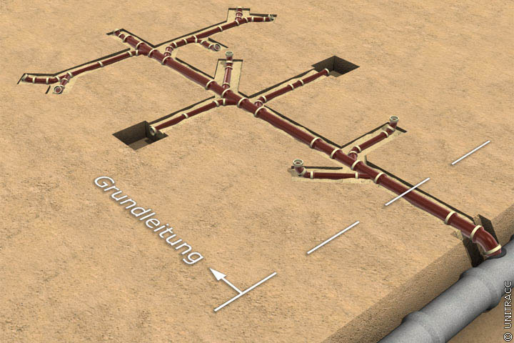 Grundleitungen sind "im Erdreich oder in der Grundplatte unzugänglich verlegte Leitungen, die das Abwasser in der Regel dem Anschlußkanal zuführen" [DIN1986:1995] (Image 1.9.1-1) (Image 1.9.1-3) (Image 1.9.1-2).
