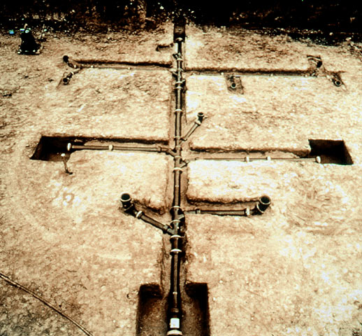 Lage der Grundleitungen unter Gebäuden - Blick in eine Baugrube mit verlegter Grundleitung aus Steinzeug [FI-Steinb] |