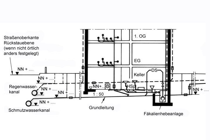 Skizze einer Sammelleitung mit Fäkalienhebeanlage im Bereich der Kellersohle [Schwe90] |