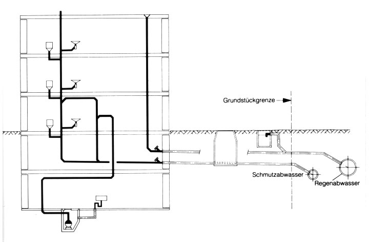 Lage der Grundleitungen unter Gebäuden - Schematische Darstellung [DIN1986:1995] |
