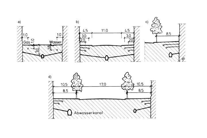 Um diese Schwierigkeiten zu umgehen, bemühte man sich relativ frühzeitig, die Leitungen nach entsprechenden Regeln im Straßenquerschnitt anzuordnen (Bild 1.11-3) .