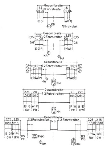 - Bei größerer Fahrbahnbreite wurden i.d.R. je zwei Leitungen (Doppelleitungen) für Gas, Wasser und Abwasser mit einer Anordnung entsprechend (Bild 1.11-3) , (Bild 1.11-3) oder (Bild 1.11-4) vorgesehen.