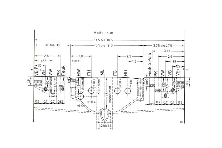 Die in dieser Norm vorgenommene Verteilung und Tiefenlage der Ver- und Entsorgungsleitungen im Straßenquerschnitt, die im wesentlichen auf der oben angeführten Praxis basierten, vermitteln (Tabelle 1.11-1) und (Bild 1.11-5) . Bei sehr breiten Gehwegen empfahl die Norm ebenfalls in diesen die Abwasserkanäle unterzubringen.