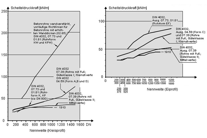 Die Tragfähigkeitsreihen zeigen eine nahezu lineare Abhängigkeit der Scheiteldruckkraft von der Nennweite. Die Ausgleichsgerade für den Bereich DN 300 bis DN 1500 lautet [Zäsch86] FN = 9,6 + 0,14 DN in kN/m.