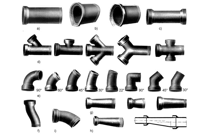 Die eiförmigen und elliptischen Rohre mit ebener Sohle wurden noch um die Jahrhundertwende in geringem Umfang in den Abmessungen 250/375, 300/450, 400/600, 500/750 und 600/900 hergestellt und verlegt [Frühl10] . Von den dargestellten Formstücken werden heute nicht mehr die Abzweige mit beidseitigen Anschlußstutzen - doppelte Gabelrohre, doppelte Stutzrohre - die Hosenrohre und die Knierohre hergestellt. Von ihrer Verwendung riet man schon 1925 ab, da sie leicht zu Kanalverstopfungen führten [Braub25] .