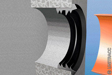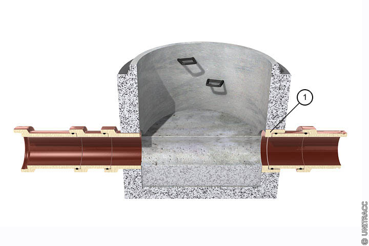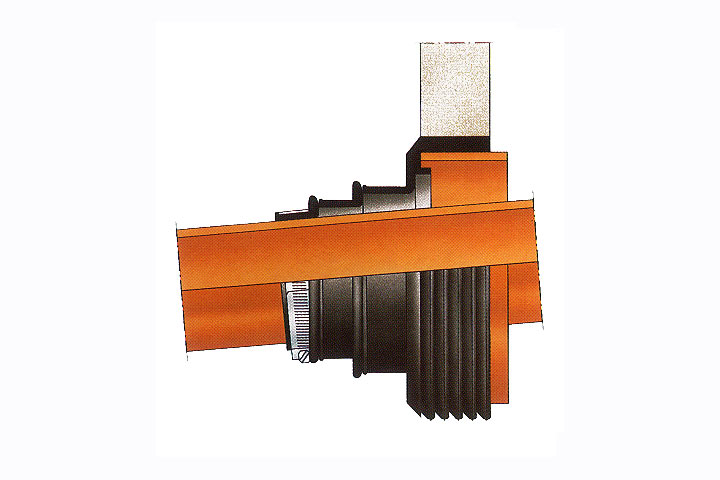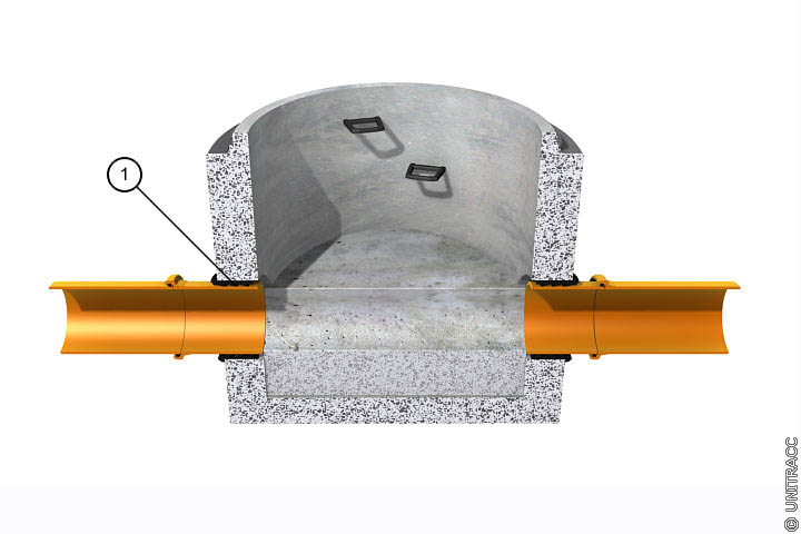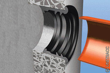 Weitere Möglichkeiten, Schachtanschlüsse für unterschiedliche Rohrwerkstoffe herzustellen, zeigen (Image 1.8.1-8), (Image 1.8.1-9) und (Image 1.8.1-10) . Bei beiden dargestellten Varianten werden zunächst die Anschlußöffnungen in der Schachtwand mit Kernbohrungen hergestellt. Die Abdichtung des Einbindungsbereiches erfolgt entweder durch eine bohrringähnliche Spezialdichtung (Image 1.8.1-8) (Image 1.8.1-9) oder mit Hilfe einer Dichtungsmanschette (Image 1.8.1-10) . Die Dichtungsmanschette wird mit einem inneren Klemmring an die Bohrlochleibung gepreßt. Die Abdichtung zum Anschlußrohr erfolgt mit Hilfe einer Schlauchschelle.