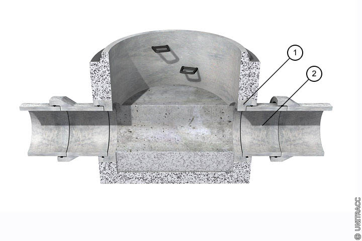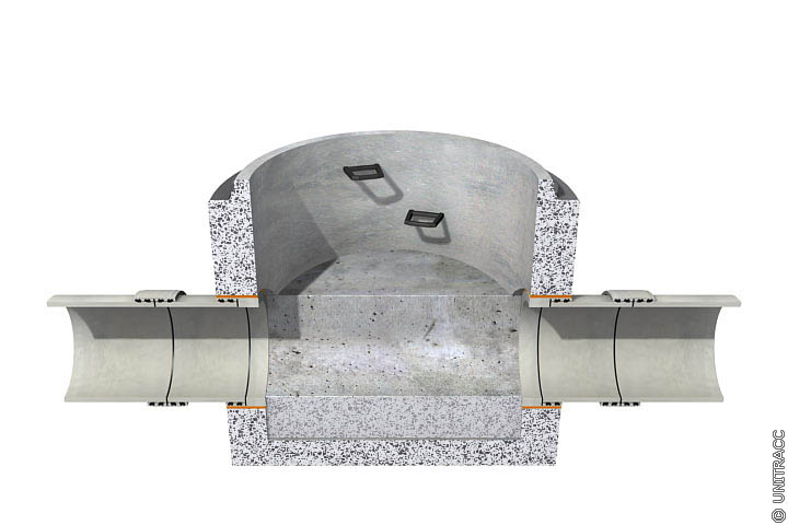 Variante 2 (Gelenkerzeugung mit Anschlußstück in der Schachtwandung) Im Unterschied zur Variante 1 befindet sich in diesem Fall jeweils ein Gelenk in der Schachtwandung. In der Regel werden Anschlußstücke in Form von Muffenverbindungen werkseitig in die Schachtfertigteile einbetoniert oder in nachträglich hergestellte Bohrungen eingeklebt, wodurch Abwasserrohre verschiedenster Werkstoffe in die Schächte eingebunden werden können. Beispiele beider Varianten zeigen (Image 1.8.1-2) , (Image 1.8.1-3) , (Image 1.8.1-4) , (Image 1.8.1-5) , (Image 1.8.1-6) , (Image 1.8.1-7) .
