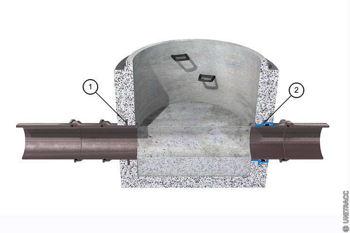 Rohranschlüsse an Schächte in Anlehnung an [ATVA2411:1978] - Anschluß von Gußrohren mit zwei Einbindemöglichkeiten [Quelle: STEIN Ingenieure GmbH] |