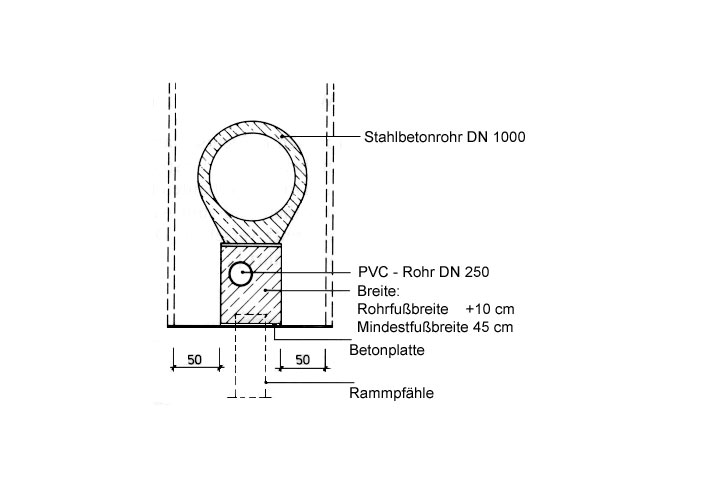 Damit liegen bei einem Trennsystem die Schmutzwasserkanäle tiefer als die Regenwasserkanäle. Bei der gleichzeitigen Herstellung dieser Kanäle wurde bis heute aus wirtschaftlichen Gründen in der Regel ein gemeinsamer Rohrgraben mit abgestufter Sohle angelegt (Bild 1.4-2) , dessen Breite geringer ist als die Summe der Grabenbreiten getrennt angelegter Rohrgräben. Nur in seltenen Fällen ordnete man die Rohrleitungen direkt übereinander an (Bild 1.4-3) (Bild 1.4-4) .