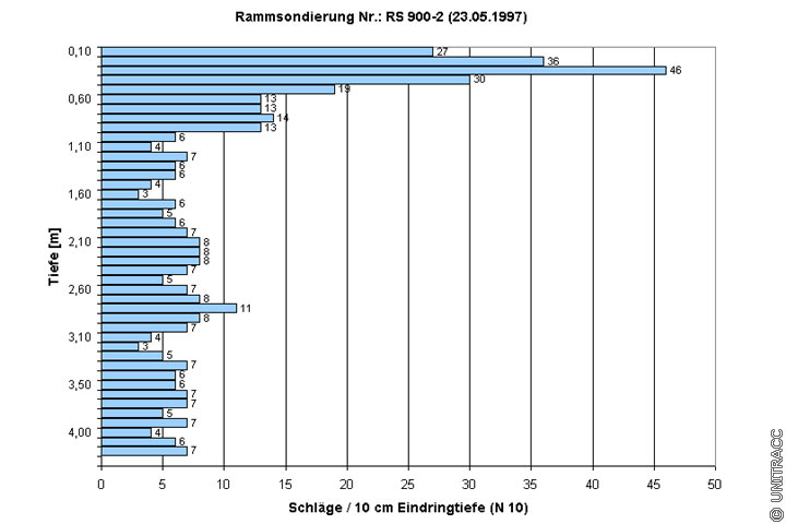 Beim Rammsondieren, dem am meisten eingesetzten Verfahren, unterscheidet man zwischen leichter, mittelschwerer und schwerer Rammsonde. Dabei wird die Sonde durch einen Rammbären mit definiertem Gewicht mit gleichbleibender Fallhöhe in den Untergrund gerammt, wobei die Eindringtiefe und die Schlagzahl festgestellt werden. Üblicherweise wird dabei die Anzahl der Schläge pro 10 cm Eindringtiefe in ein Meßprotokoll notiert [DIN4094] .
