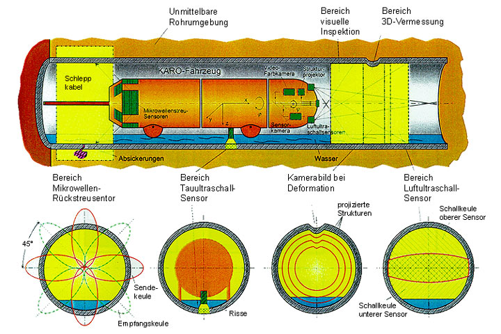 Der Kanalroboter (KARO-System) ist vor allem für die Inspektion von Kanälen aus Beton- und Steinzeugrohren DN 200 bis DN 500 und eine Reichweite bis zu 400 m konzipiert (Image 4.3.2.3.1-1) (Image 4.3.2.3.1-2) (Image 4.3.2.3.1-3) [Kuntz95] . Das modulare Systemkonzept besteht, neben einer hochauflösenden TV-Technik, aus verschiedenen Sensoren, insbesondere optische, Ultraschall- und Mikrowellensensoren, die in der Lage sind, Art, Ort und Umfang von Schäden im Rohr, Unregelmäßigkeiten in der Rohrwand und in der näheren Rohrumgebung während der Inspektionsfahrt des mobilen Trägerfahrzeuges zu detektieren. Die Verknüpfung der verschiedenen Sensorinformationen wird auf der Grundlage von Fuzzy-Logik durchgeführt. Darüber hinaus gestattet ein optionaler Kartographiemodul, unbekannte Lageverläufe von Kanälen meßtechnisch zu erfassen.