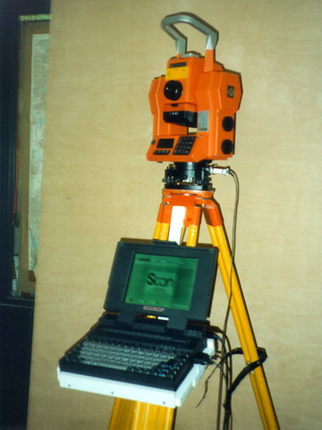 Zur Messung wird das Gerät auf einem Stativ im Kanal aufgestellt. Das Scannen der Mantellinien und Querprofile erfolgt vollautomatisch mit einer frei vorgebbaren Punktdichte, wobei für jeden Meßpunkt dreidimensionale Raumkoordinaten bestimmt werden. Der Messungsablauf wird von einem Notebook gesteuert; dabei wird die erfaßte Geometrie auf dem Bildschirm dargestellt und die Meßdaten werden gespeichert. Durch die grafische Darstellung auf dem Bildschirm läßt sich die Meßwerterfassung vor Ort während des Meßvorgangs kontrollieren. Gleichzeitig kann ein Soll-Ist-Vergleich erfolgen (Image 4.3.2.2.3-2) .