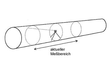Von ein und demselben Gerätestandpunkt an einer frei wählbaren Stelle im Kanal können beliebig viele Profile aufgenommen werden; die Reichweite pro Standpunkt ist nur in Kanallängsrichtung begrenzt und abhängig von der Nennweite: Für DN 2000 beträgt der aktuelle Meßbereich ca. 12 Meter (Image 4.3.2.2.3-3) .
