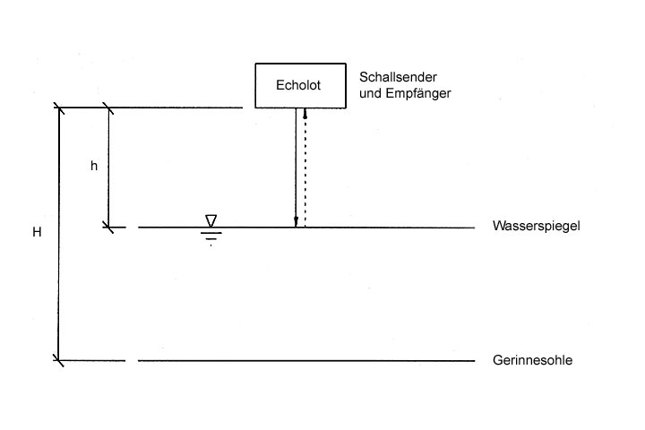 Der Standard-Meßwertaufnehmer zur berührungslosen Fließtiefenmessung ist das Ultraschall-Echolot. Das Meßprinzip basiert auf der Reflexion gepulster Ultraschallsignale von der Wasseroberfläche (Image 4.4.2.1.2-1) .
