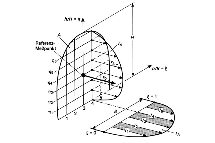 Eine weitere Meßmethode, die ohne Querschnittseinengung auskommt, ist die Netzmessung. Bei diesem Verfahren werden ebenfalls zwei Größen zur Bestimmung des Volumenstroms benötigt: zum einen die Fließtiefe, über die die durchflossene Fläche berechnet wird, zum anderen die mittlere Fließgeschwindigkeit im Gerinne. Zur Ermittlung des Geschwindigkeitsprofils werden innerhalb eines hydraulisch angepaßten Rasters im Gerinne Einzelgeschwindigkeiten gemessen. Die mittlere Fließgeschwindigkeit wird durch Planimetrie oder numerische Integration der durch die einzelnen Geschwindigkeitsvektoren aufgespannten Flächen über den durchflossenen Querschnitt ermittelt (Image 4.4.1.5.1.3.3-1) [Kölli] [VDIVDE2640] .
