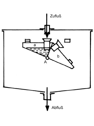 Für die Bestimmung sehr kleiner Volumenströme, für den kurzzeitigen Einsatz oder zur Kalibrierung anderer Meßeinrichtungen können volumetrische Verfahren verwendet werden. Dabei werden gleichzeitig das Volumen (über kalibrierte Behälter) und die Zeit gemessen. Um den Vorgang für Langzeitmessungen zu automatisieren, werden häufig Kippzähler eingesetzt (Image 4.4.1.5.1.2-1) . Der zweikammerige Behälter ist auf der Achse A drehbar gelagert. Nach Füllung mit einem konstanten Volumen kippt der Behälter auf die andere Seite und löst dadurch einen Zählimpuls aus [Bonfi87] .