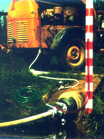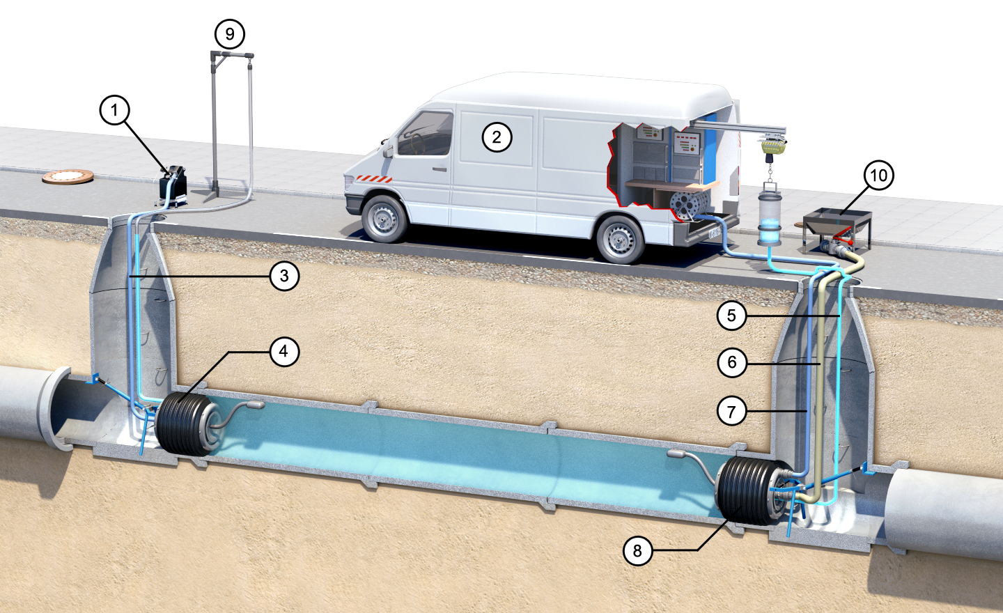 Das Prinzip einer solchen Prüfung zeigen (Image 4.5.1.2-1) und (Image 4.5.1.2-2) . Der beidseitige Abschluß der Haltung erfolgt mit Absperrelementen in denen Anschlüsse für Druckluft zum Aufblasen der Gummiabdichtungen der Absperrelemente sowie zur Befüllung des Prüfraumes mit dem Prüfmedium und dessen Entlüftung sowie zur Druckkontrolle integriert sind.