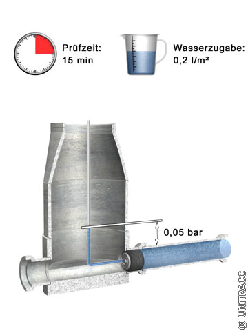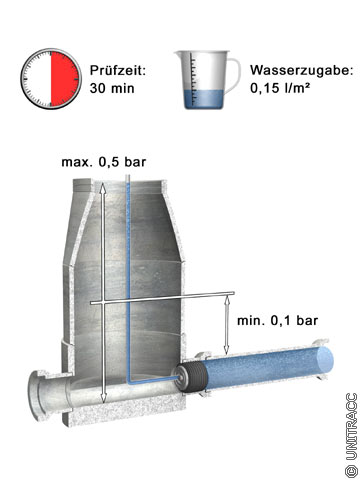 Im Anschluß an die Vorfüllzeit wird ein Prüfdruck von 0,5 bar (bei Mauerwerkskanälen 0,1 bar) über dem tiefsten wasserbenetzten Punkt der Leitung aufgebracht. Die Leitung gilt als wasserdicht, wenn die zur Aufrechterhaltung des Prüfdruckes erforderliche Wasserzugabe in l/m2 benetzter Rohrinnenfläche während der Prüfzeit von 15 Minuten die zulässigen Grenzwerte nicht überschreitet und die Rohrverbindungen dicht sind.