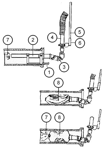 Der Test erfolgt i.a. haltungsweise, wobei Haltungslängen bis zu 300 m in einem Arbeitsgang untersucht werden können. Die Haltungen werden normalerweise mit Absperrblasen oder Sandsäcken verschlossen. Eine Spezialentwicklung zeigt (Bild 4.5.1.10-3) .