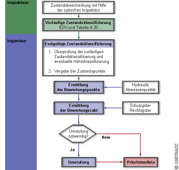 Im (Image 4.7.4.1.6-1) ist die Vorgehensweise bei der Zustandsklassifizierung und -bewertung mittels des ATV-Bewertungsmodells schematisch dargestellt.