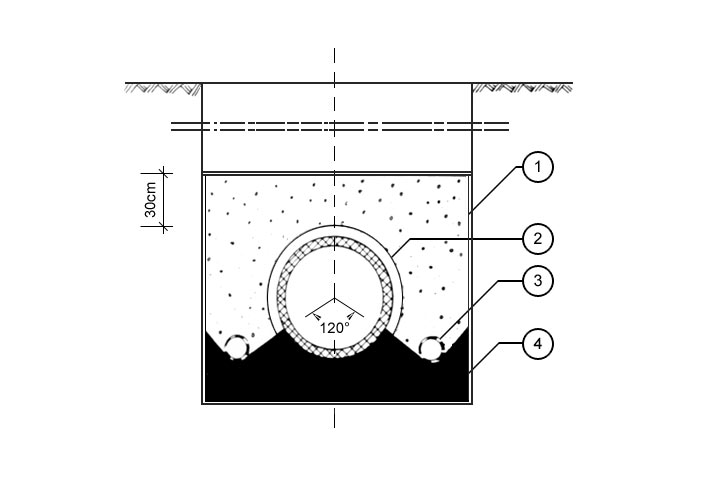 Schmutzwasserkanäle werden auf einem Betonauflager eingebaut und mit Dränagekies gebettet, wobei die erforderlichen Bettungsbedingungen erreicht werden und gleichzeitig ein Filterkörper aufgebaut wird. Parallel dazu werden die Dränrohre auf einem profilierten Betonauflager verlegt. Der gesamte Kieskörper ist mit filterstabilem Geotextil umgeben (Image 6.4.2.1.4-1) .