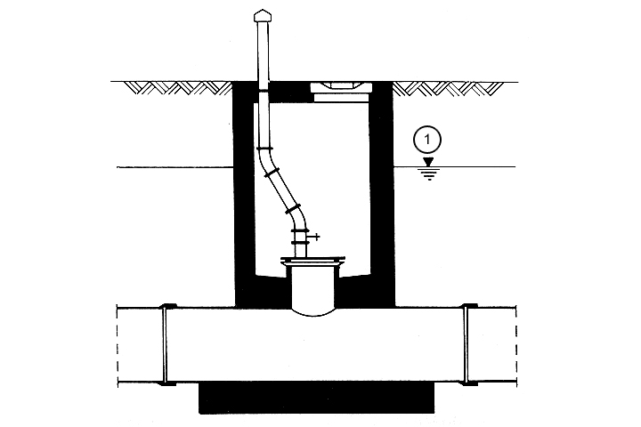 In den Schächten sind Vorrichtungen vorzusehen, die eine Dichtheitsprüfung während des Betriebes ermöglichen. Außerdem muß ausreichender Platz für die Kontrolle der verlegten Leitungen zur Verfügung stehen [ATVM146] (Image 6.4.2.1.5-1) .
