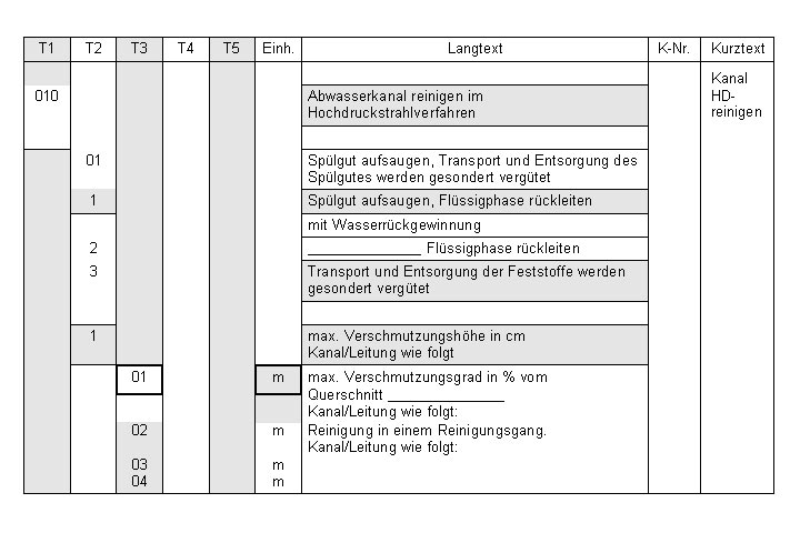 Der Leistungsbereich 309 des StLB [LB309] beschränkt sich auf nichtbegehbare Abwasserkanäle und -leitungen und gliedert sich in folgende Teilbereiche bzw. -leistungen: