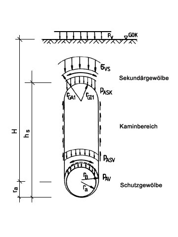 Aussagen über die Belastung von mittels des dynamischen Berstverfahrens verlegten Rohrleitungen ermöglichen Untersuchungsergebnisse der Ruhr-Universität Bochum aus den Jahren 1993-95 [Falk95b] . Nach einer Modellvorstellung von Falk [Falk95b] ist der Sekundärzustand II gekennzeichnet durch vertikale, nach unten gerichtete Bodenverschiebungen innerhalb einer begrenzten Bodenzone über der Leitung, die als Bruchbereich bezeichnet werden kann (Image 5.4.3.5.4-1) . Hieraus ergibt sich eine Erddruckbelastung, die mit einem analytischen Berechnungsverfahren ermittelt werden kann. Grundlagen dieser Modellvorstellung sind neben den Ergebnissen der oben angeführten Großversuche an der Ruhr-Universität Bochum experimentelle und theoretische Untersuchungen von Fagerer [Fager80] , Bolton [Bolto79] , Feder [Feder82] und Vavrovsky [Vavro87] .