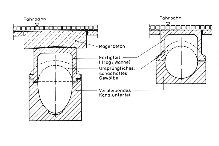 Bei begehbaren Kanälen mit Schäden ausschließlich im Scheitel- bis hin zum Kämpferbereich ist eine Teilerneuerung, die sich auf diese Bereiche beschränkt, möglich. Über Ausführungen nach dem sog. Hauben- oder Gewölbeverfahren wird in [Kuczy80] berichtet.
