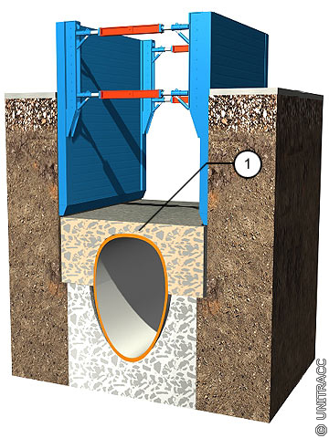 Beim Haubenverfahren werden der obere Bereich des Kanals abgetragen und eine vorgefertigte Stahlbetonhaube aufgesetzt (Image 5.4.1-1) .